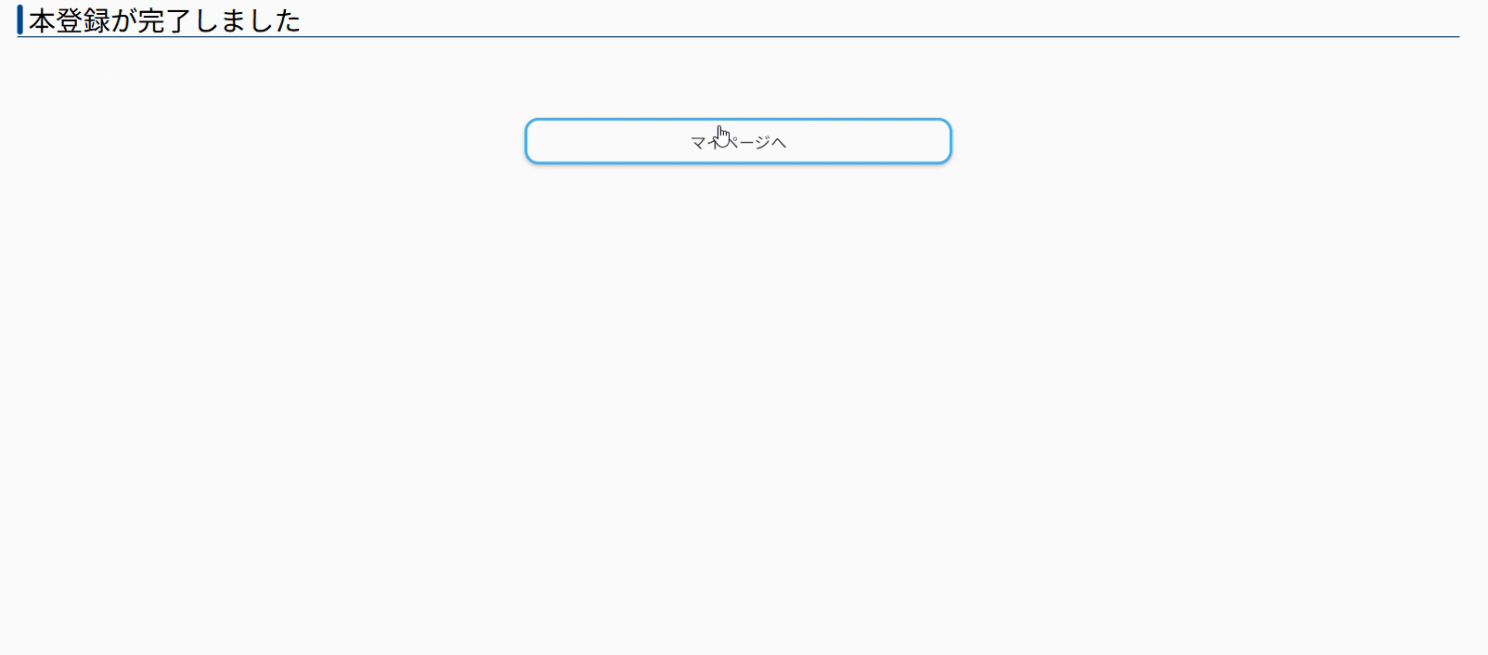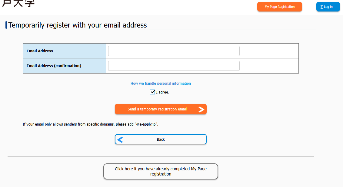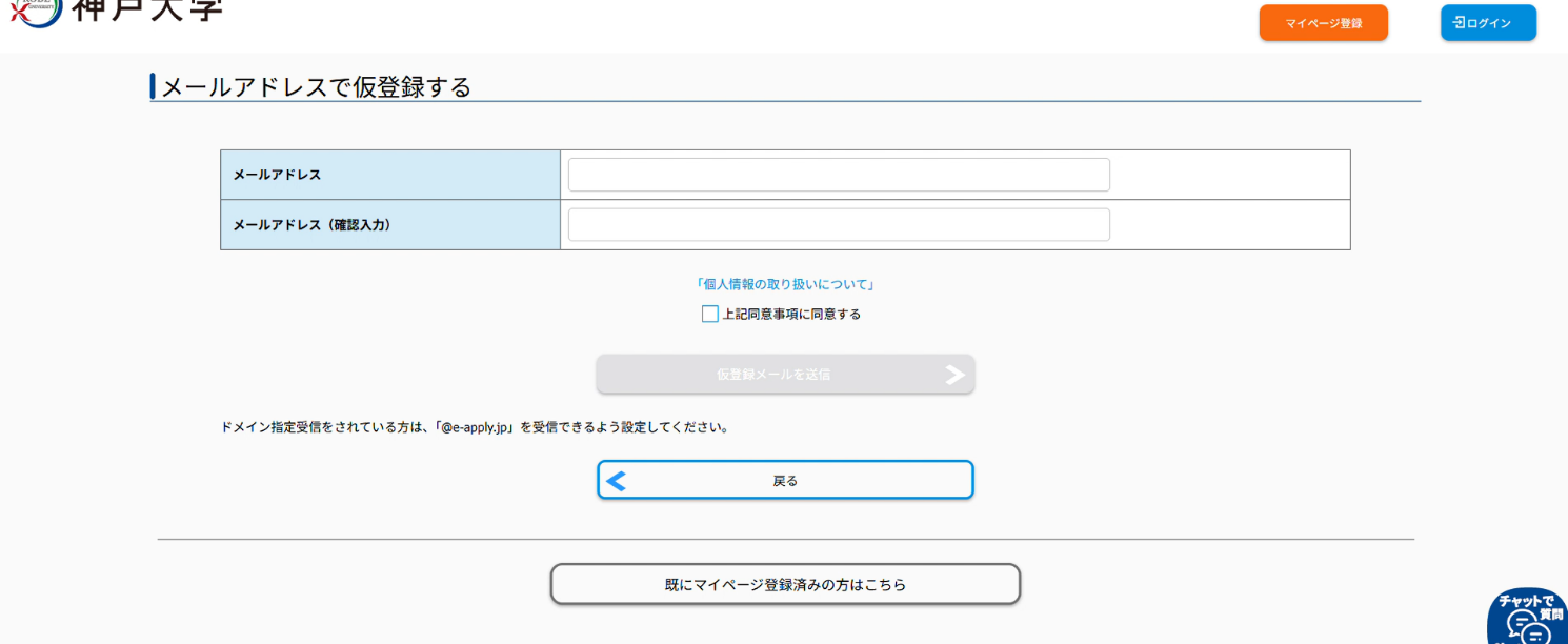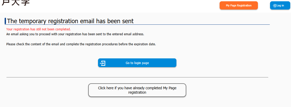 When the following screen appears, a Japanese email titled "【神戸大学】マイページへ本登録のご案内" will be sent to the registered email address from no-reply@e-apply.jp.When the following screen appears, a Japanese email titled "【神戸大学】マイページへ本登録のご案内" will be sent to the registered email address from no-reply@e-apply.jp.