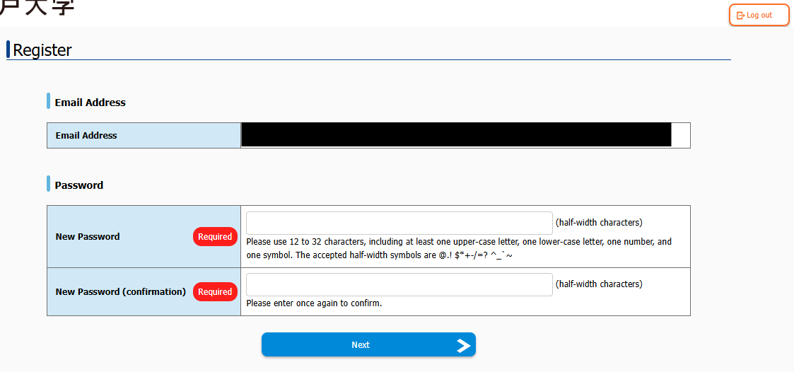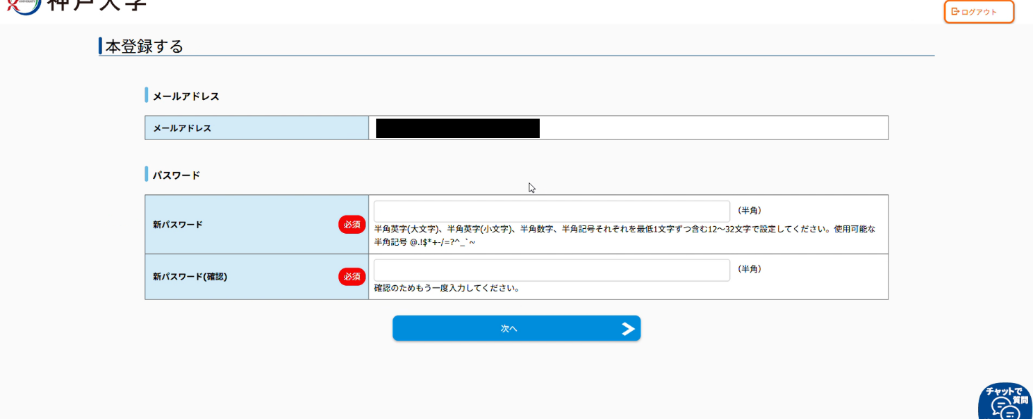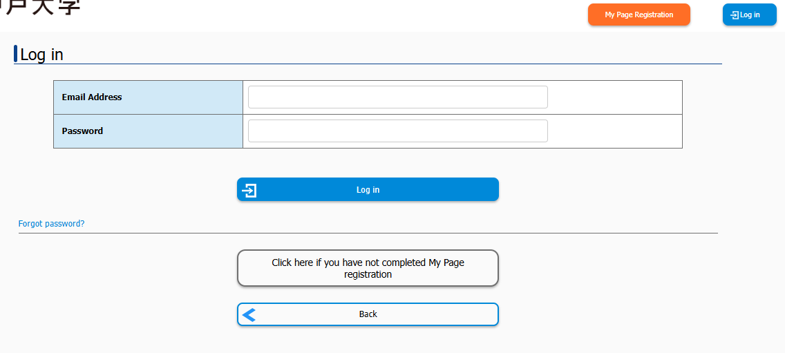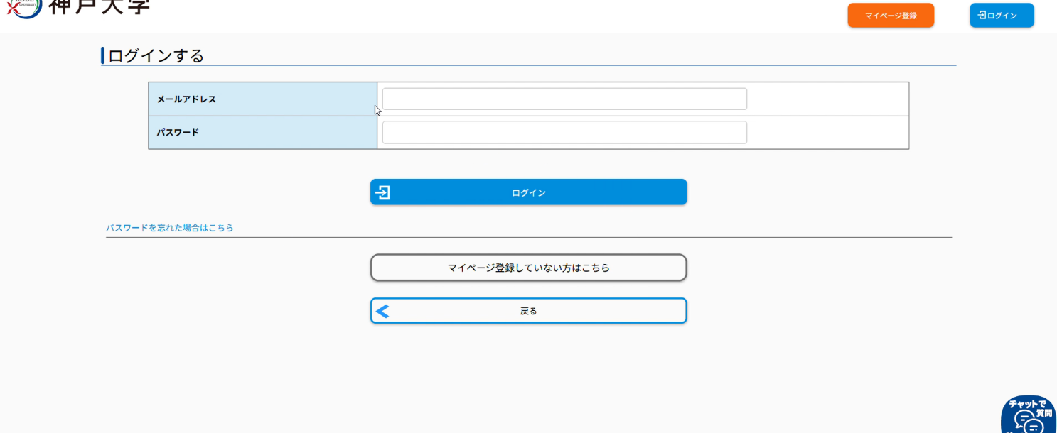 Access the full registration URL provided in the body of the "【神戸大学】マイページへ本登録のご案内" email, enter the login information (email address and password) from the email into the login screen and login.