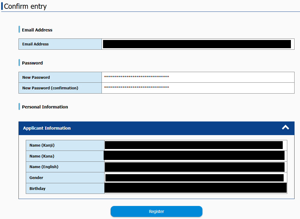 When the confirmation screen appears, verify that the entered information is correct and press the [Register] button.