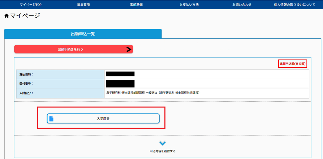 支払いが完了するとマイページに表示されている出願する入試の右上に「出願申込済(支払い済)」とステータスが変わります。また、「入学願書」がダウンロードできるようになります。