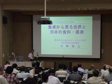 当日は、天候にも恵まれ、定刻通り、内田一徳農学研究科長の挨拶(13:00~13:05)のあと、まず、13:05~14:50に続けて3名の講師による講義が行われました。講義の内容は、食卓から見た世界と日本の食料・農業をめぐる問題についての総括的な話(小野雅之教授)からはじまり、洪水環境に適応すべく戦略をとった浮稲の話(東 哲司准教授)、北米を中心に西洋ミツバチが消え去った現象から日本の里山における生態系サービスについての話(前藤 薫教授)でした。回収アンケートの結果からも、農学についての基礎的知識から総括的知識までの幅広い内容の講義は、興味深く、わかりやすいものであったという評価をいただきました。休み時間に及ぶ活発な質問から参加者の皆様の農学に対する興味の深さを感じました。