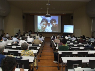今回の公開講座は、「大学の地域貢献と農業・農村の再生」と題して、本研究科が地域とどのように関わりを持ち、農業に対してどのように取り組んでいるかを理解していただくことを目的に実施しました。定刻通り、内田一徳農学研究科長の挨拶のあと、前半は地域貢献と教育研究について3題、後半は農業・農村の再生について2題の講義を行いました。まず、高田理教授が農学研究科地域連携センターのついての概略を説明し、続いて宇野雄一准教授が農業農村フィールド演習の成果と現況について報告しました。この演習科目は、学生が実際の農作業を体験し、自らの研究にフィードバックすることが目的で、当日の現地での様子を中継して見ていただく予定でした。残念ながら回線不良で、十分にはご覧いただくことができませんでしたが、教室や実験室とは違った学生の一面を垣間見ることができたと思います.次に,中塚雅也助教が,丹波の「赤じゃが」というブランドをどのように開発したかについて話をしました。多くの方が、大学がブランド開発にかかわっていることに興味を示され、「どんなものか食べてみたい」という声をいただきました。