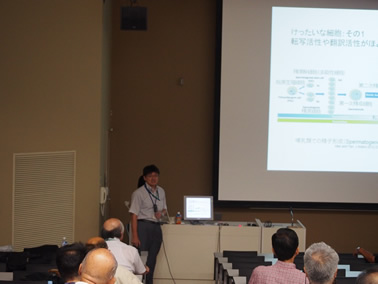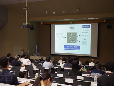 定刻通り、芦田均農学副研究科長の挨拶のあと、まず、吉川潮教授に「遺伝子組換え技術を用いた哺乳動物の研究方法」と題して、その基本原理から微生物を宿主としたヒトのインスリンの合成や緑色蛍光タンパク質による生命現象の可視化まで分かり易く解説していただきました。