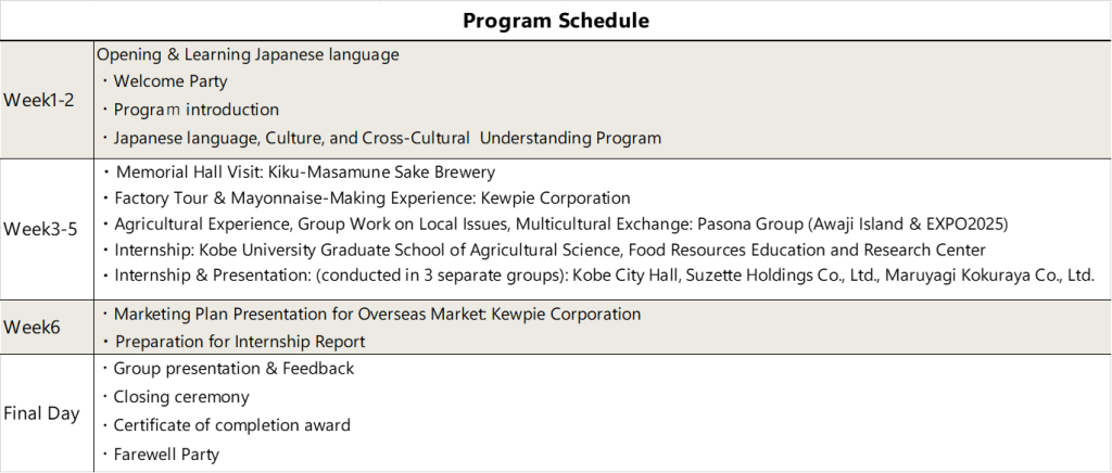From July 16 to August 8, internships at Kiku-Masamune Sake Brewing Co., Ltd., Kewpie Corporation, Kobe City Government, SUZETTE Co., Ltd., PASONA Group Inc., Maruyanagi Foods Inc., and Kobe University Food Resources Education and Research Center (Graduate School of Agricultural Science) were conducted as part of the “Industry - Government - Academia Collaboration Internship Program”. The internship program featured diverse activities, including interactions with foreign employees, introductions to food-related initiatives such as food loss prevention measures, creating overseas marketing plans, harvesting crops, and conducting research at the Osaka Expo site. On the final day of the internship at each company, students delivered presentations.